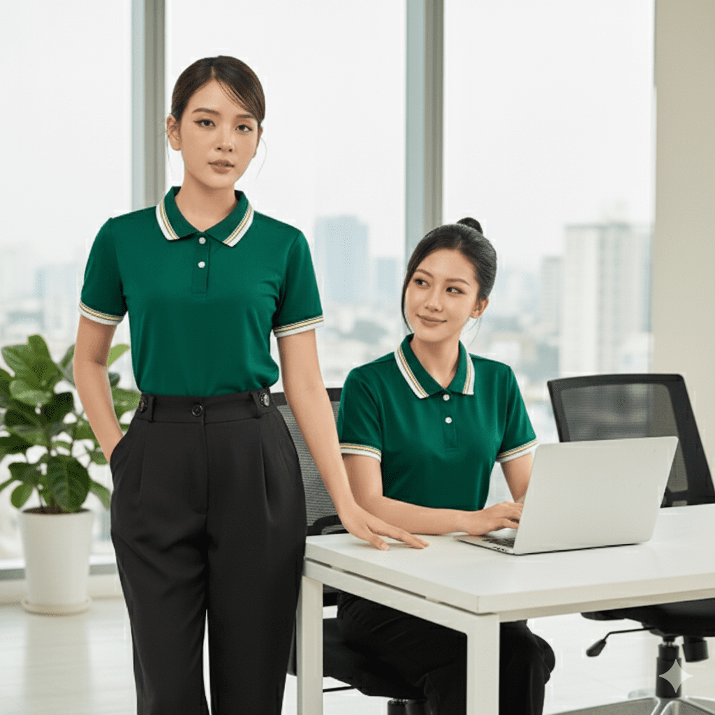 - Áo Cổ Bẻ (Polo): Lịch sự, chuyên nghiệp, dễ dàng kết hợp với môi trường văn phòng. Phù hợp cho các ngành dịch vụ, bán hàng, hoặc công ty muốn xây dựng hình ảnh cao cấp.